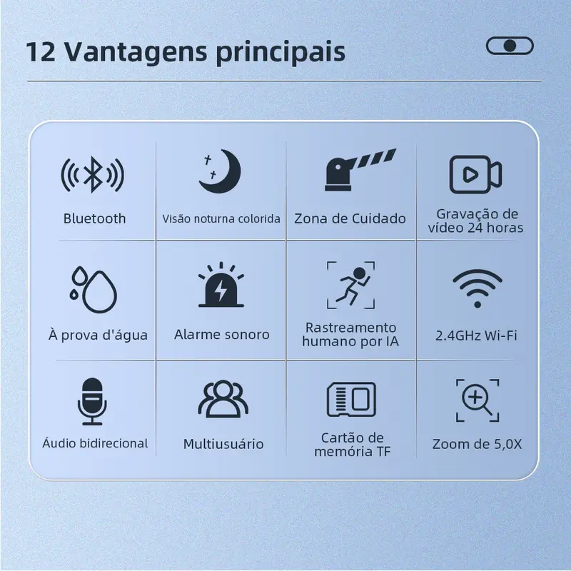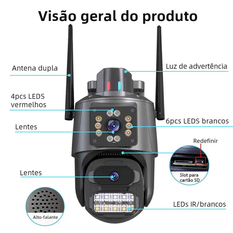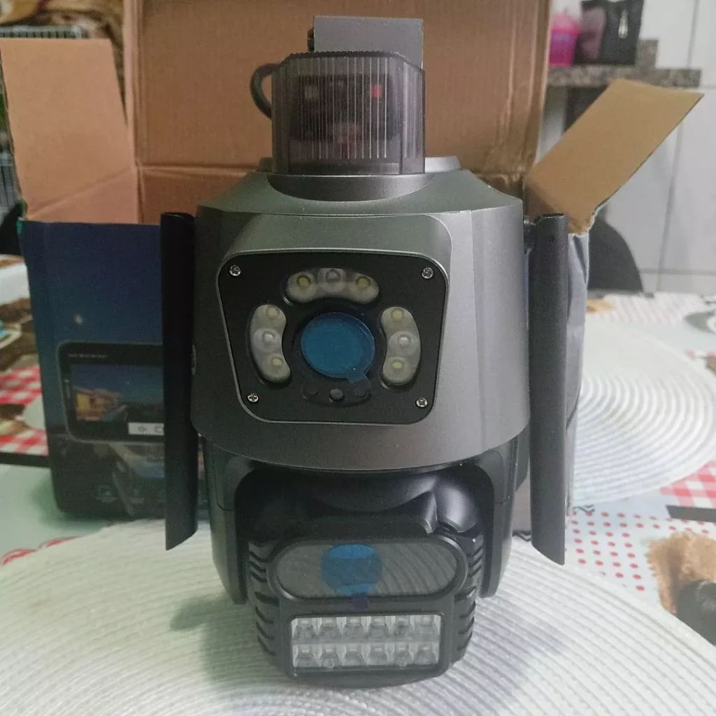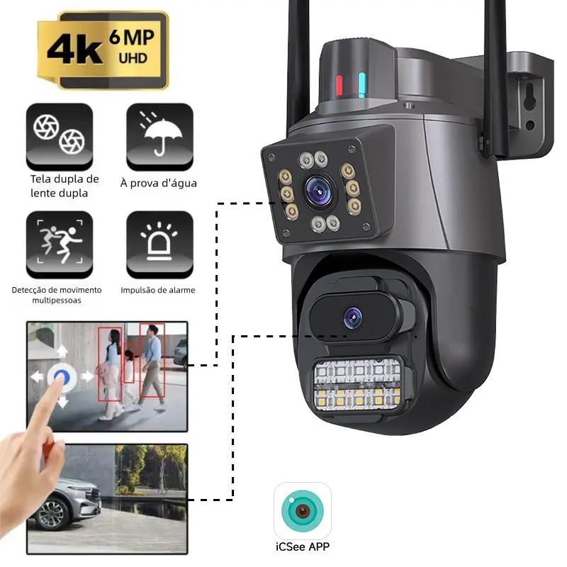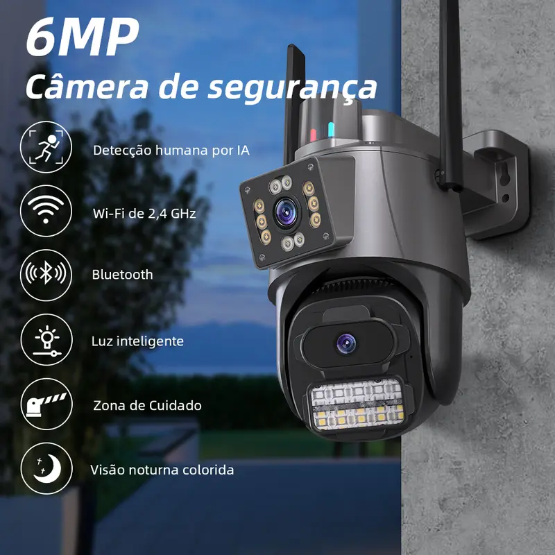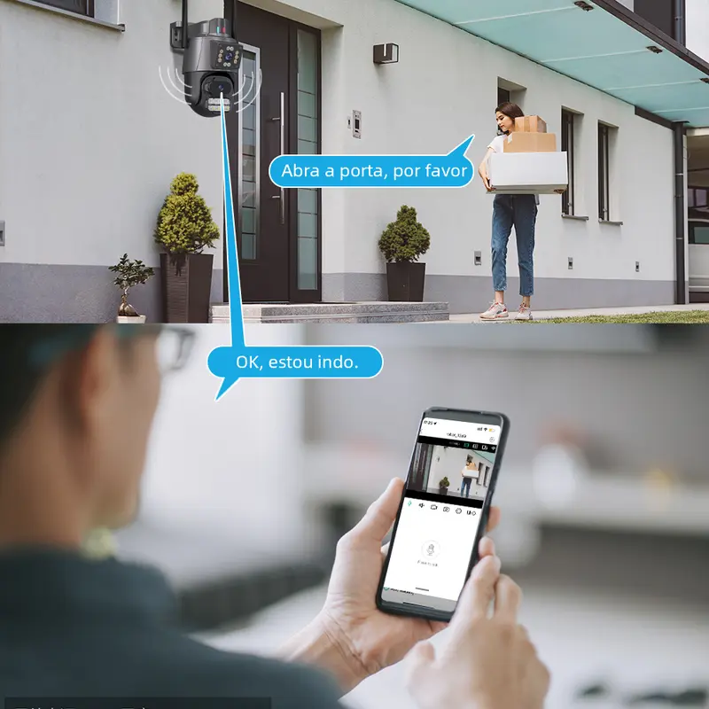 Com lente dupla, giro 360° e resolução 4K, ela vigia cada detalhe e te avisa no celular em segundos.